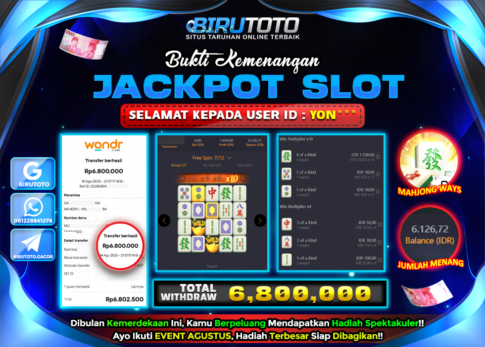 BIRUTOTO JACKPOT SLOT MAHJONG WAYS Rp.6.800.000 LUNAS