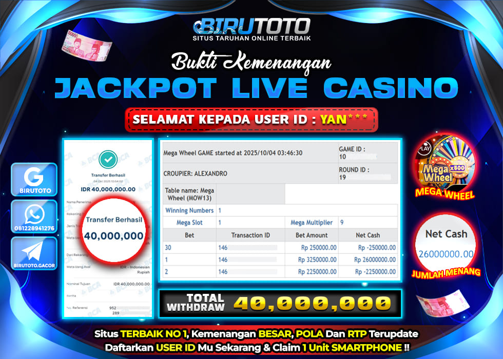 BIRUTOTO JACKPOT LIVE CASINO MEGA WHEEL Rp.40.000.000 LUNAS