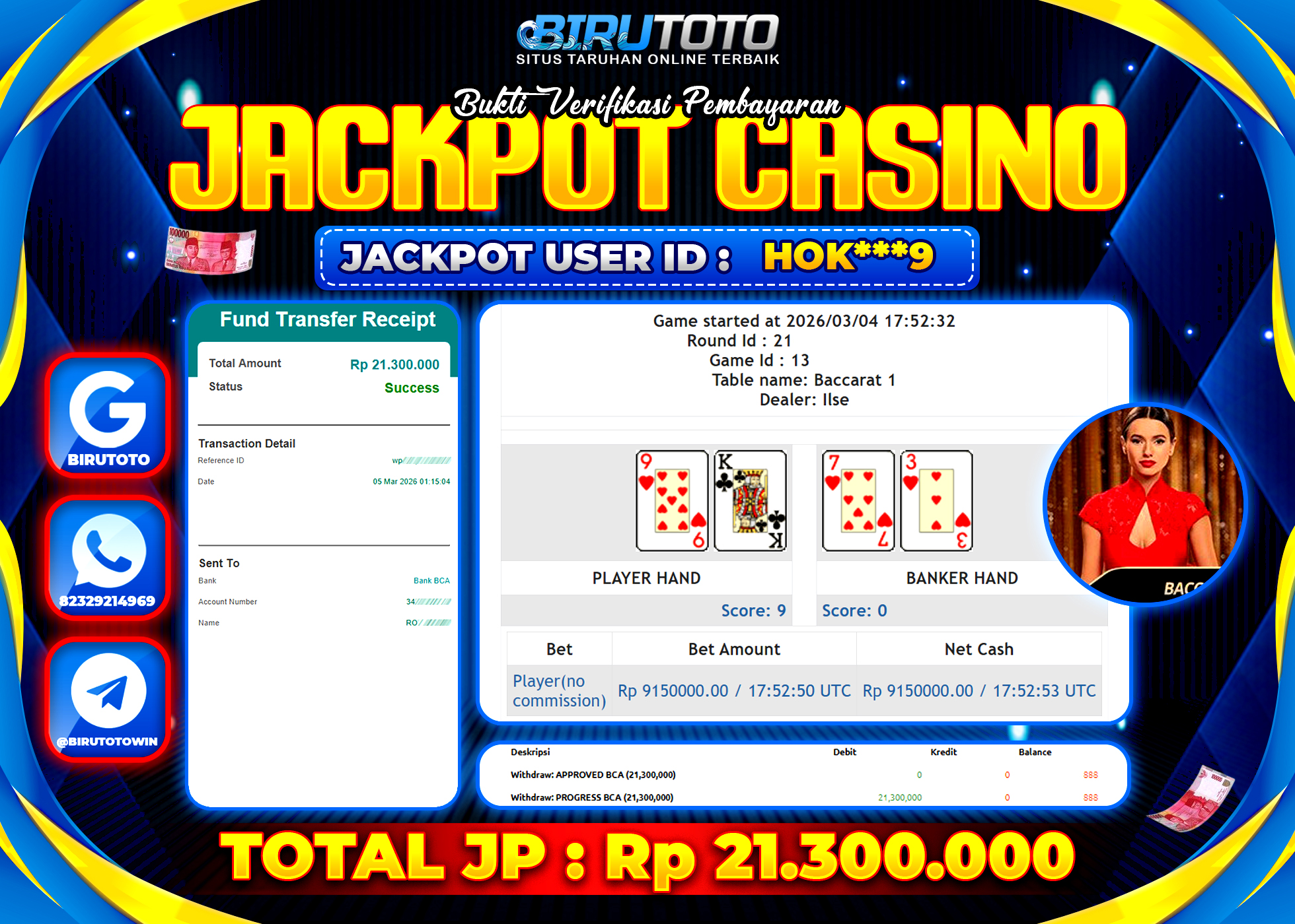 BIRUTOTO JACKPOT LIVE CASINO BACCARAT Rp.21.300.000 LUNAS