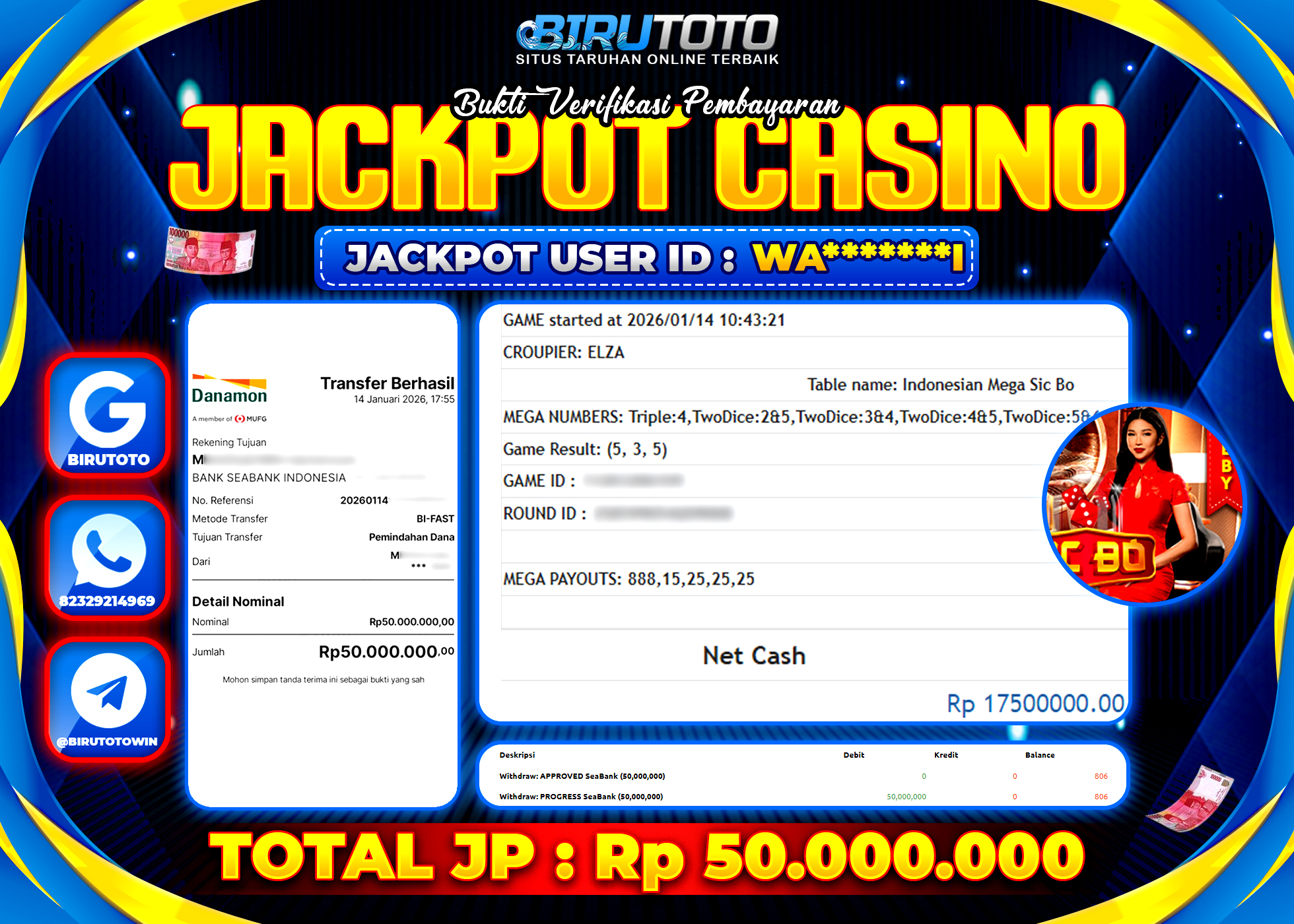 BIRUTOTO JACKPOT LIVE CASINO MEGA SICBO Rp.50.000.000 LUNAS