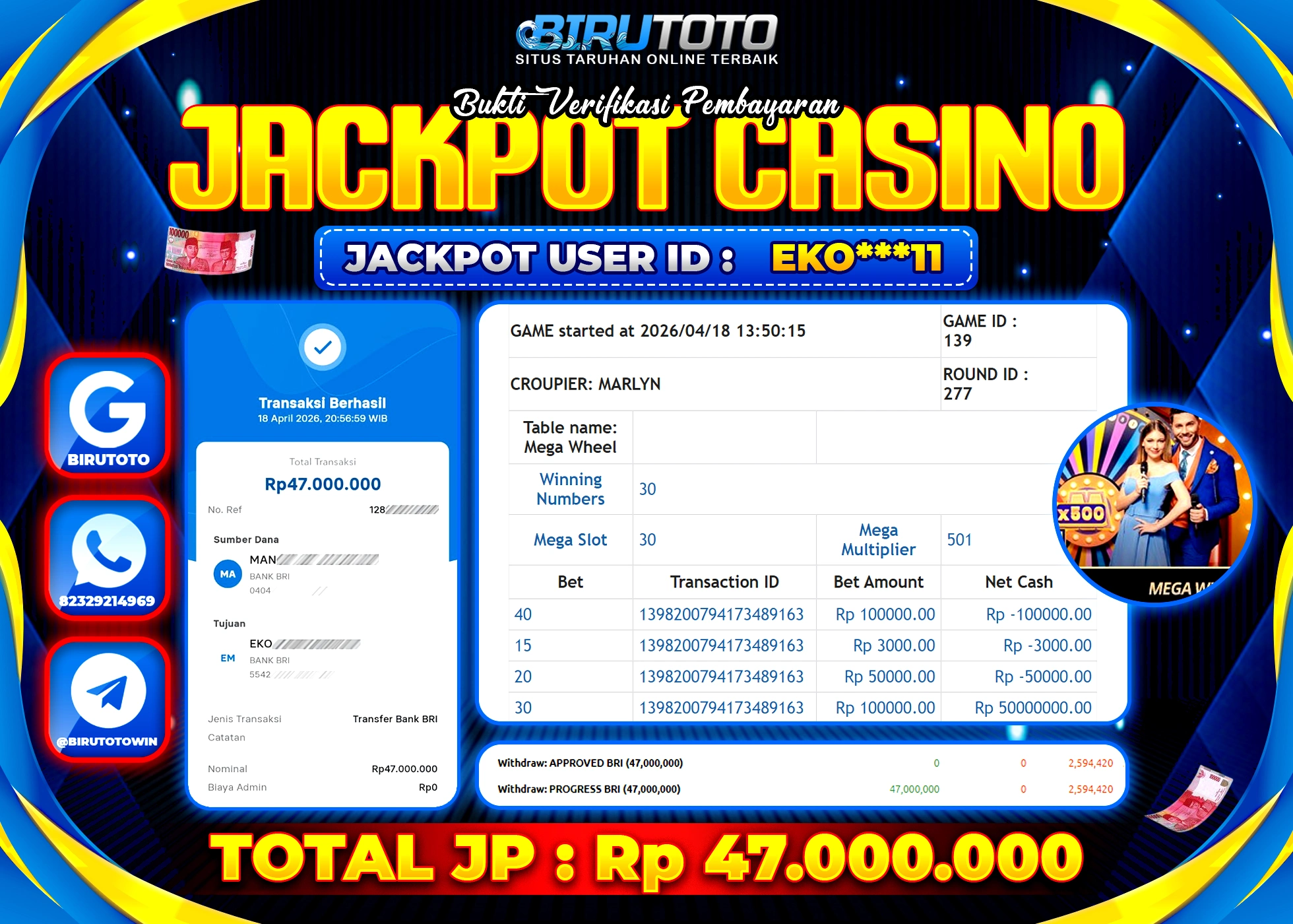 BIRUTOTO JACKPOT LIVE CASINO MEGA WHEEL Rp.47.000.000 LUNAS