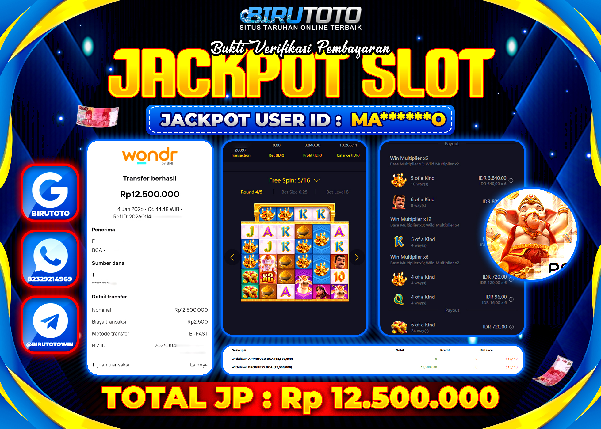 Selamat Kepada Member BIRUTOTO MA**** Telah Jackpot Di SLOT GANESHA FORTUNE