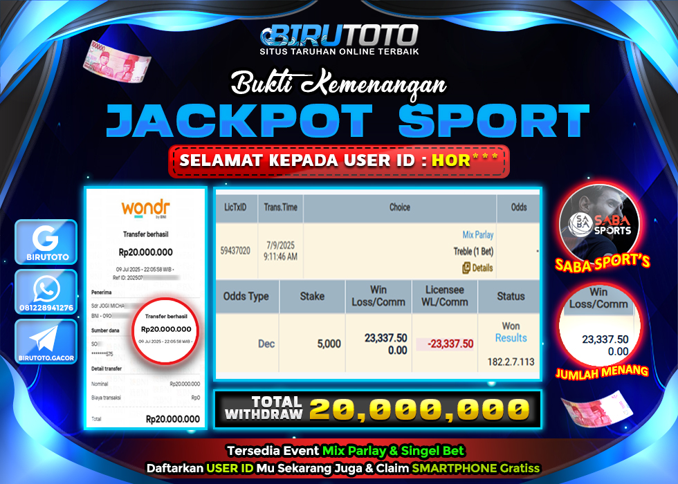 BIRUTOTO JACKPOT SABA SPORT MIX PARLAY Rp.20.000.000 LUNAS