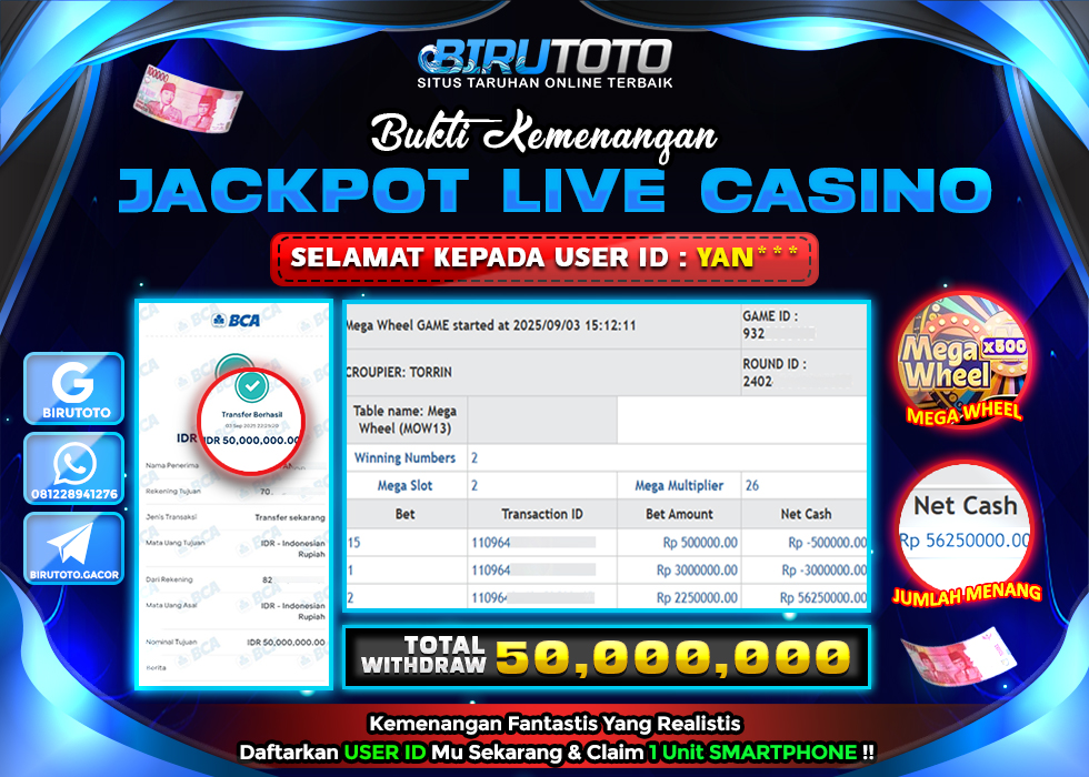 BIRUTOTO JACKPOT LIVE CASINO MEGA WHEEL Rp.50.000.000 LUNAS