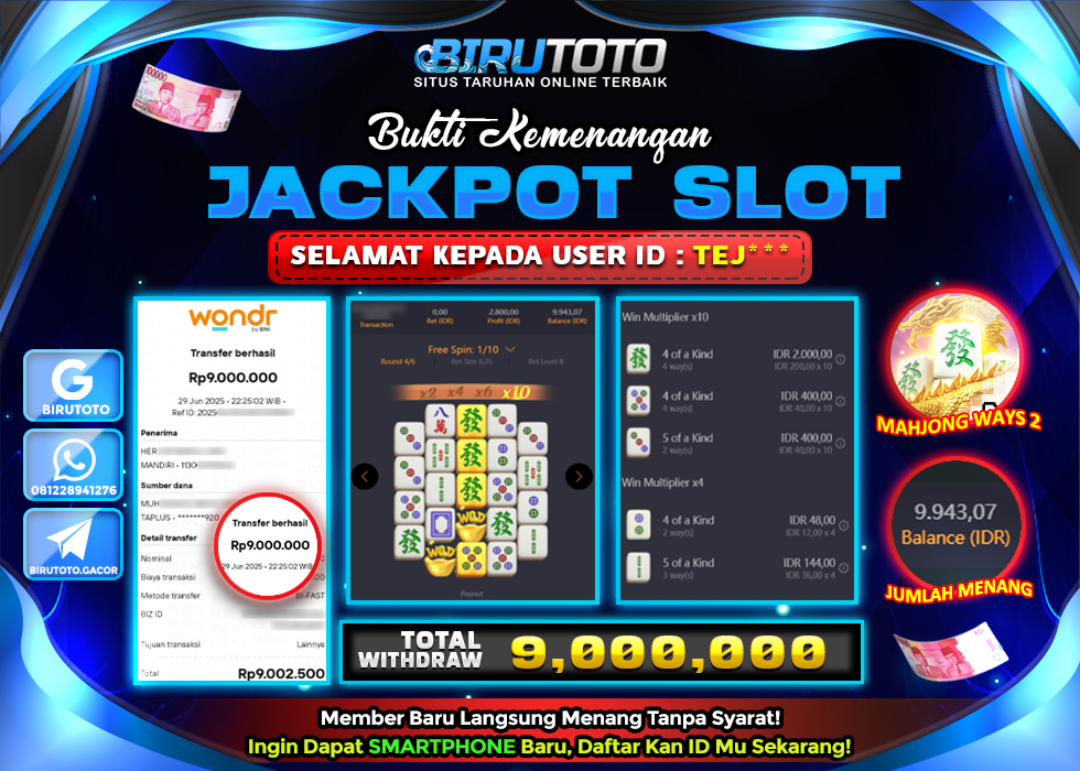 BIRUTOTO JACKPOT SLOT MAHJONG WAYS 2 Rp.9.000.000 LUNAS