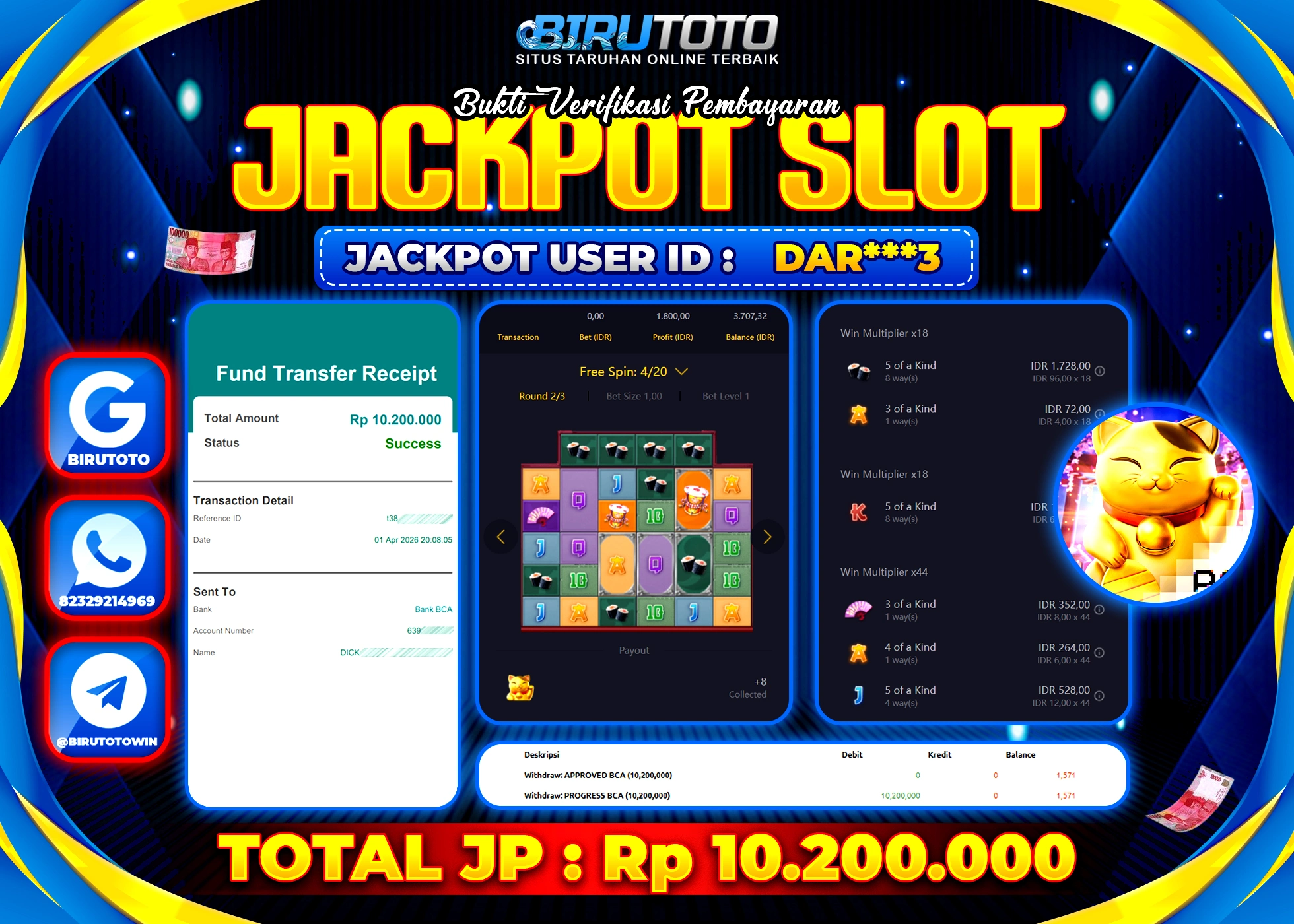 BIRUTOTO JACKPOT SLOT LUCKY NEKO Rp.10.200.000 LUNAS